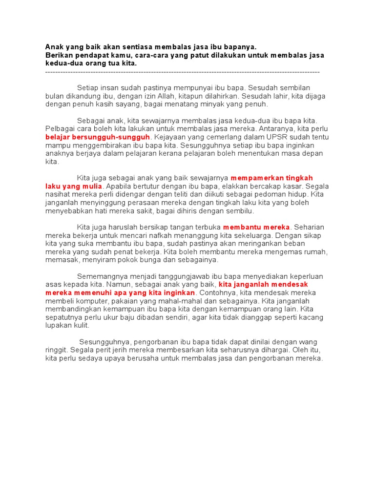 Jasa bakti mereka yang telah melahir dan membesarkan kita amatlah. Gambar ini hanya sebagai hiasan sahaja Nak tahu cara-cara menghormati ibu bapa anda. Berikut ini adalah contoh karangan UPSR bagi tajuk Cara-cara Menghormati Ibu Bapa.